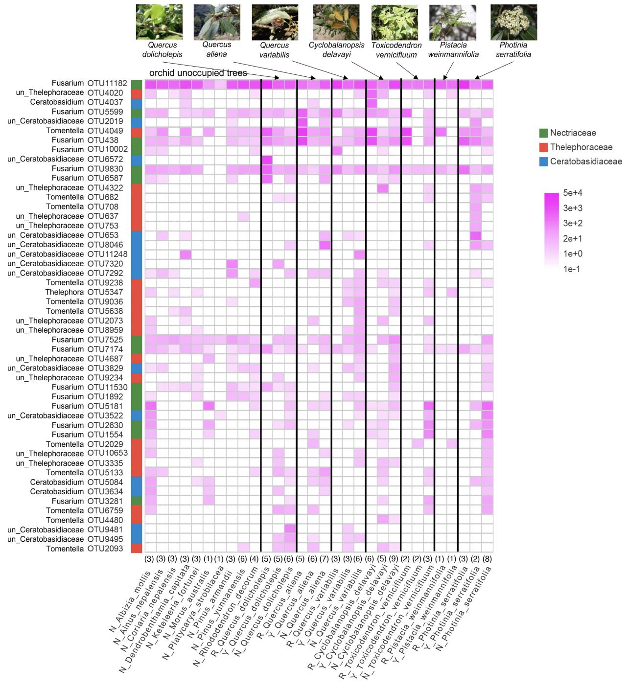 本研究以中国特有金沙江石斛Dendrobium wangliangii为材料,研究首先发现金沙江石斛偏好附生于壳斗科植物(Fig. 1)。利用迁地共生萌发,从偏好性附生宿主植物的树皮中鉴定出Fusarium属促萌发真菌。原生境共萌发试验表明,仅在金沙江石斛偏好附生的宿主物种上观察到原球茎和幼苗的形成。真菌群落结构分析进一步表明,具促萌发功能的Fusarium属真菌OTU11182在金沙江石斛所生长群落中所有树种的树皮上丰度高且广泛分布(Fig. 2),表明这种附生兰科植物的宿主偏好性不受促萌发共生真菌分布的限制。针对依赖真菌才能实现种子萌发的附生植物而言,生物因子不是附生植物与宿主间特化关系形成的关键,推断附生植物偏好性可能是由宿主树皮的非生物因素所造成的。