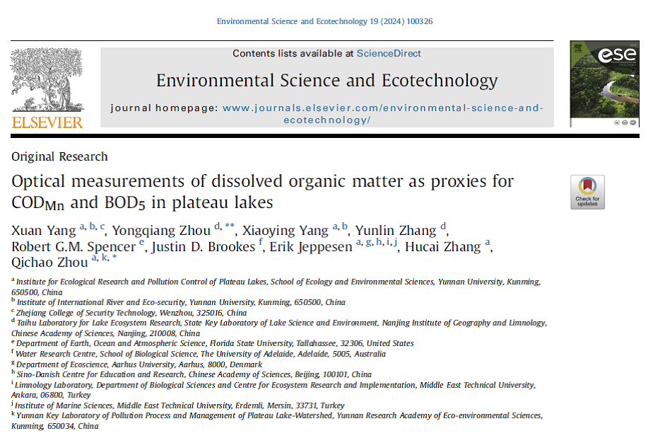 近日,我院周起超小组联合中国科学院南京地理与湖泊研究所周永强博士等国内外学者,站位区域尺度提出并验证了溶解性有机物(DOM)光谱特性对高原湖泊CODMn和BOD5的指示能力,相关成果以“Optical measurements of dissolved organic matter as proxies for CODMn and BOD5 in plateau lakes”为题发表于生态环境领域知名期刊Environmental Science and Ecotechnology(中科院一区TOP,IF=12.6)。