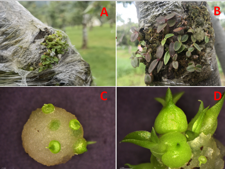 图1, 铁皮石斛“真菌-种子袋”和“种子-真菌复合体”。A:用保鲜膜将“真菌-种子袋”固定在树干上3个月后,即可产生大量的幼苗;B:每个“真菌-种子袋”可产生8-15株幼苗,1年后的幼苗情况;C:把铁皮石斛种子和亲和菌株的菌丝包埋形成的“种子-真菌复合体”,播种30天可见种子萌发形成绿色的原球茎;D:“种子-真菌复合体”播种60天形成的幼苗。
