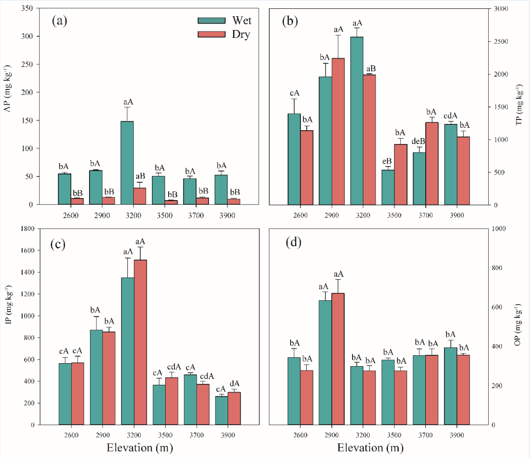 进展一(玉龙雪山土壤磷组分沿海拔分布格局及其控制因素):土壤磷是陆地生态系统中重要的生命元素,对陆地生态系统的稳定和可持续发展具有重要意义。但目前关于山地系统中不同土壤磷库在不同海拔中的季节变化特征及其调控机制的了解还相对较少。基于此,团队以云南玉龙雪山不同海拔高度(2600 m – 3900 m)土壤全磷、速效磷、无机磷、有机磷、活性磷、中活性磷和稳定磷的季节变化特征为研究对象,探究了叶片养分含量、土壤性质、微气候和微生物等因素对土壤磷库变化的调控作用。结果表明,由于中海拔地区(2900 m和3200 m)有着较活跃的微生物和适宜的土壤气候条件促进了磷的风化,导致该地区的土壤各种磷组分含量均最大。不同树种叶片磷含量与土壤速效磷库密切相关。夏季较高的土壤温度和微生物活性增加了土壤磷的矿化能力,导致夏季不同海拔土壤速效磷含量均显著高于冬季。土壤微生物磷、酸性磷酸酶和可溶性有机碳对土壤不同磷库的变化有着较强的影响,这为研究山地生态系统中不同土壤磷库变化对环境的响应提供了重要的理论依据。研究结果以“Elevational variation in soil phosphorus pools and controlling factors in alpine areas of Southwest China”为题发表在Geoderma(IF = 7.42,中科院一区)上。bat365中文官方网站已出站博士后李金升和已毕业硕士生吴宝云为论文共同第一作者,程晓莉教授为论文唯一通讯作者。原文链接:https://www.sciencedirect.com/science/article/pii/S0016706123000381?via%3Dihub