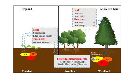 进展五(造林下凋落物分解对土壤碳、氮、磷库的影响):基于进展四的研究结果,研究团队同时结合地上和地下凋落物产量监测数据,探讨了土地利用变化背景下,地上和地下凋落物分解与土壤C、N和P库的关系。结果发现,灌丛土壤全磷累积量在地上凋落物质量和微生物的调控下显著高于人工林和农田。人工林土壤全氮累积量在地下凋落物质量和微生物的介导下显著高于灌丛和农田。此外,人工林和灌丛通过增加细根来源的新有机碳输入量促进土壤有机碳的积累。表明地上和地下凋落物分解的变化是由凋落物、土壤和微生物性状的不同组合介导,这导致了土地利用变化后土壤碳氮磷积累的差异。研究结果以“Divergent controls on leaf and root litter decay linking to soil C, N, and P pools under a subtropical land-use change”为题发表在Ecosystems(IF = 4.35,中科院二区)上,bat365中文官方网站博士生隆春艳为论文第一作者,程晓莉教授为论文唯一通讯作者。原文链接:https://doi.org/10.1007/s10021-023-00827-3