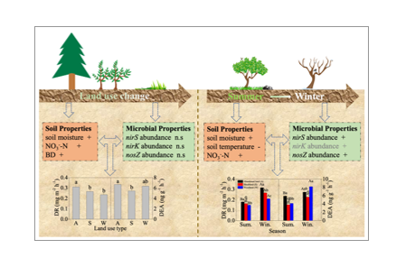 进展六(造林下土壤反硝化的驱动机制):由于营养元素(氮、磷)之间耦合关系,氮循环在陆地生态系统中同样具有重要意义,然而土地利用变化下土壤反硝化速率和微生物功能之间的内在机制尚不清楚。团队基于丹江口库区三种典型土地利用方式为研究对象,通过田间试验,探究了不同土地利用类型在不同季节(夏季和冬季)土壤反硝化速率、反硝化基因nirS、nirK和nosZ的丰度和多样性。结果发现,土壤反硝化速率在农田最高,人工林最低。农田和人工林的土壤反硝化酶活性均高于灌丛。夏季的反硝化速率和反硝化酶活性均低于冬季。土壤水分、土壤有机碳和NO3--N浓度是不同土地利用类型间调控土壤反硝化作用的主要因子。土壤水分和反硝化功能基因是季节间土壤反硝化作用之间产生差异的主要调控因子。研究结果以“Stronger effects of environmental factors than denitrifying genes on soil denitrification under a subtropical land use change”为题发表在Catena(IF = 6.37,中科院一区)上,bat365中文官方网站已毕业博士生陈琼为第一作者,程晓莉教授为论文唯一通讯作者。原文链接:https://www.sciencedirect.com/science/article/abs/pii/S0341816222008621?via%3Dihub