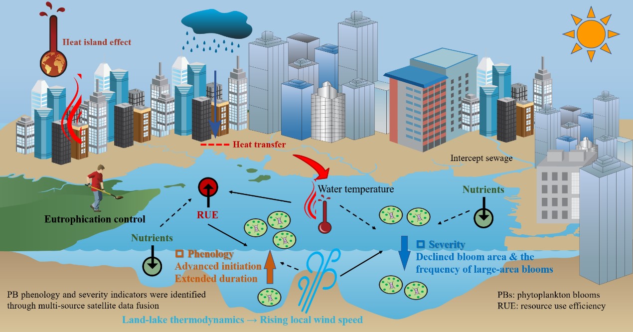 近日,bat365中文官方网站高原湖泊生态与治理研究院周起超小组联合国内外学者在浮游植物(藻类)水华长期动态及其驱动机制的研究中取得新进展,相关成果以“Urbanization shifts long-term phenology and severity of phytoplankton blooms in an urban lake through different pathways”为题发表于生态环境领域知名期刊Global Change Biology(原文链接https://doi.org/10.1111/gcb.16828)。