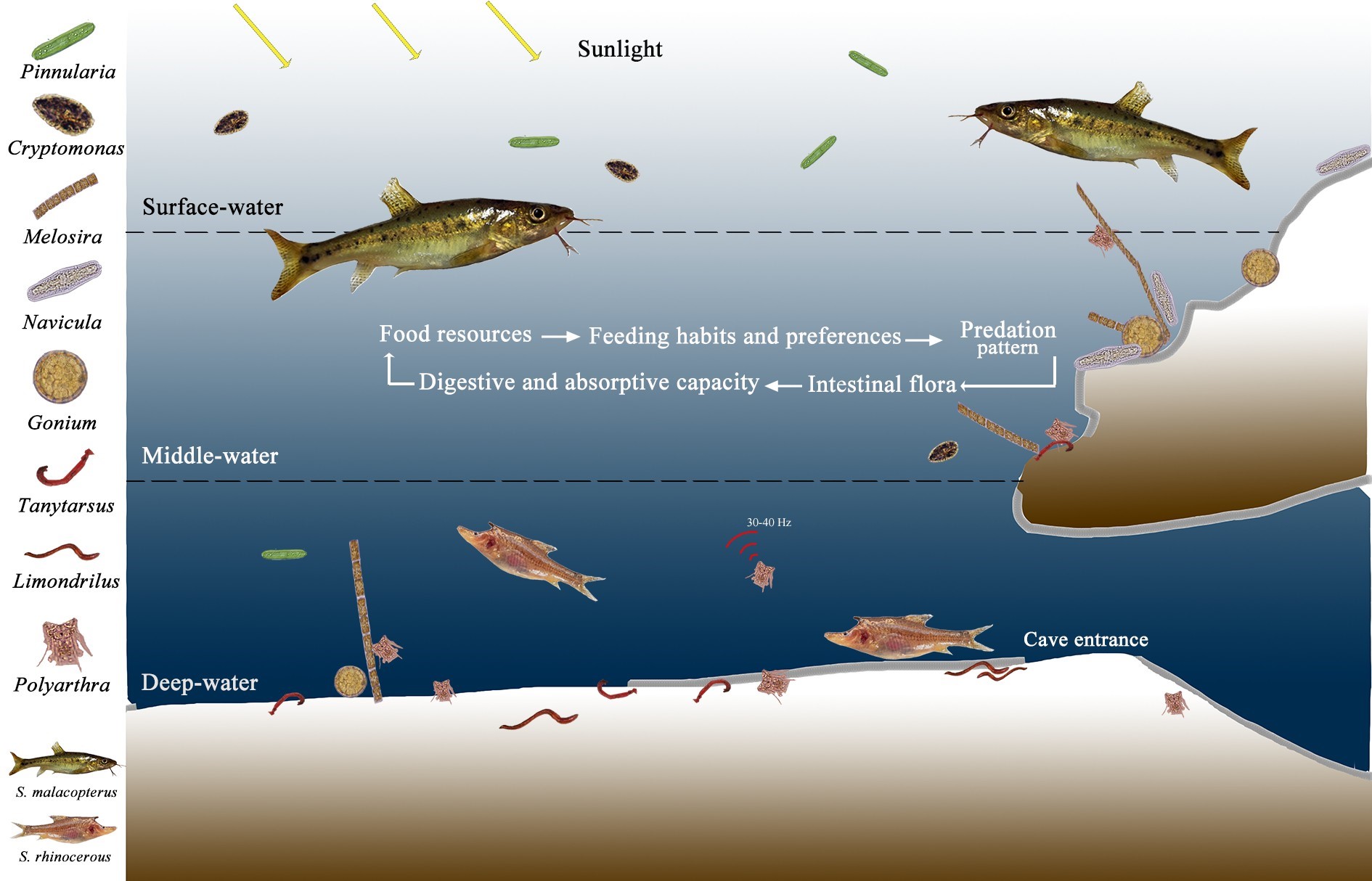 bat365中文官方网站陈善元教授和肖蘅教授团队长期致力于金线鲃属鱼类相关研究,且在国内外率先开展了该属鱼类的分子生态学研究。最近,该团队选择我国特有的金线鲃属鱼类作为研究对象开展宏基因组分析,揭示了洞穴型和地表型金线鲃物种肠道微生物和栖息地适应之间的隐藏联系。在该研究中,比较分析了金线鲃属洞穴型和地表型物种肠道微生物的特征(图2),并进一步建立了肠道微生物与它们栖息地微生物之间的关系。此外,还对环境样本进行了eDNA(条码)分析,以明确金线鲃属洞穴型和地表型物种生境中潜在食物资源构成。结果发现,与系统发育关系相比,金线鲃属鱼类肠道微生物的组成和结构与生态类型(生境类型)更相关。然而,生境微生物的水平转移只是鱼类肠道微生物的一种来源,宿主对固有的(肠道)微生物表现出强烈的选择而成为优势微生物。肠道微生物组成和结构的差异,特别是优势微生物的差异,可以从食物摄取、营养物质利用和有害物质代谢等角度增强两类型金线鲃属鱼类的生境适应性。这种联系最终形成了一个通过食物资源-捕食模式-肠道菌群-消化吸收能力以及摄食习惯和偏好的生境适应性环(图3)。该研究的结果促进了我们对鱼类肠道微生物对生境适应性意义的理解,为研究洞穴鱼类的适应机制提供了一个新的视角,为我国特有的金线鲃属鱼类资源保护提供了新的参考信息。