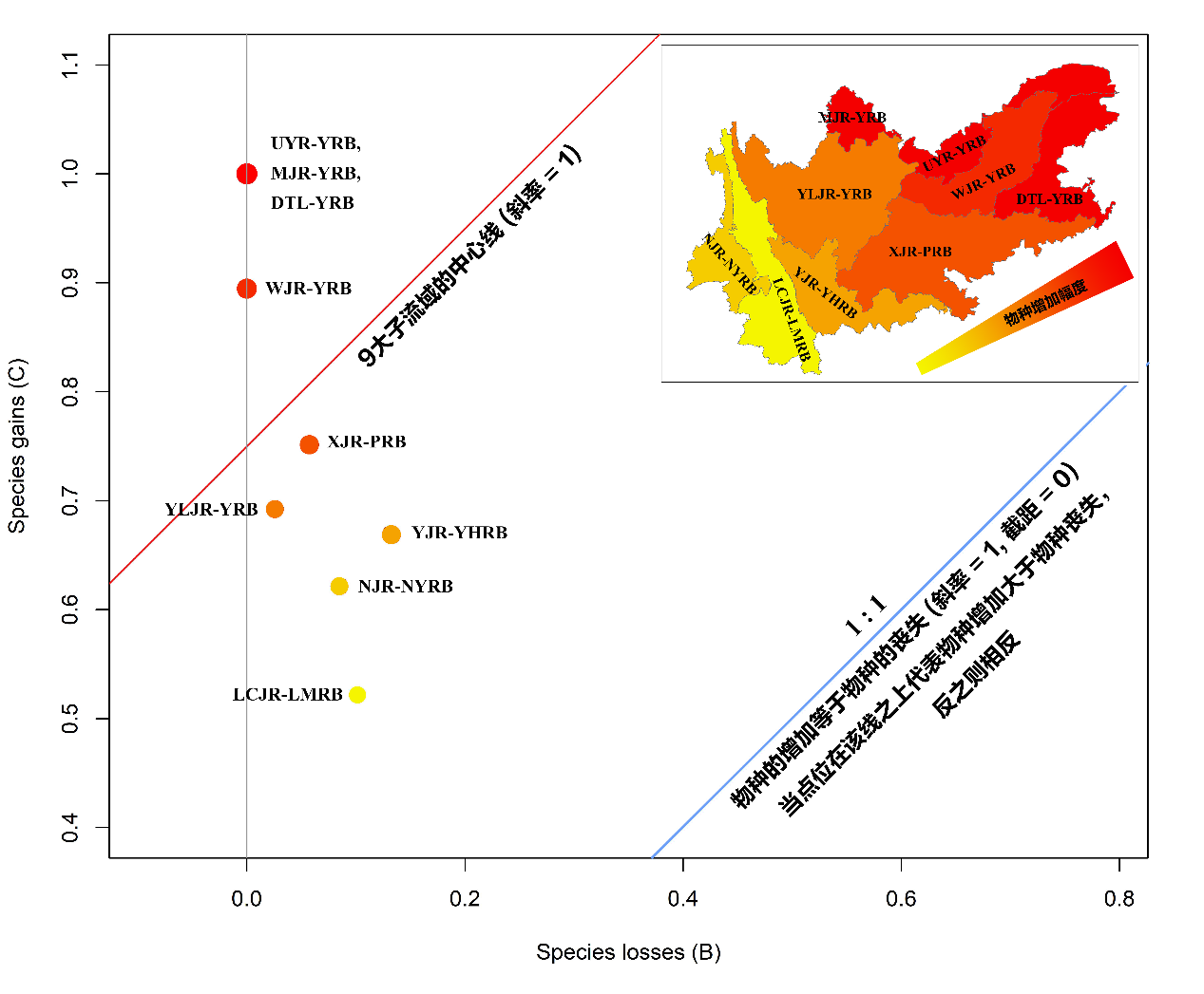 图4 云贵高原鱼类丰富度数据的物种增加-丧失(Species gains-losses)图。蓝线(表示物种的增加和丧失相等,斜率为1)上方的红线(穿过子流域点的中心点,与的蓝线平行)显示,大多数子流域物种收益大于损失,表明改革开放前后物种增加占主导地位。右上角各流域的物种增加图显示,越远离中部发达地区,物种增加就越少。