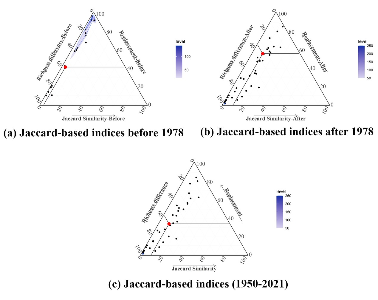 图3 基于β多样性分解的云贵高原鱼类群落beta多样性三元相图。每个点代表一对子流域。(a)分别由改革开放之前和(b)改革开放之后的Jaccard指数计算;(c)根据Jaccard指数显示1950年至2021年九个研究子流域鱼类群落结构的差异。