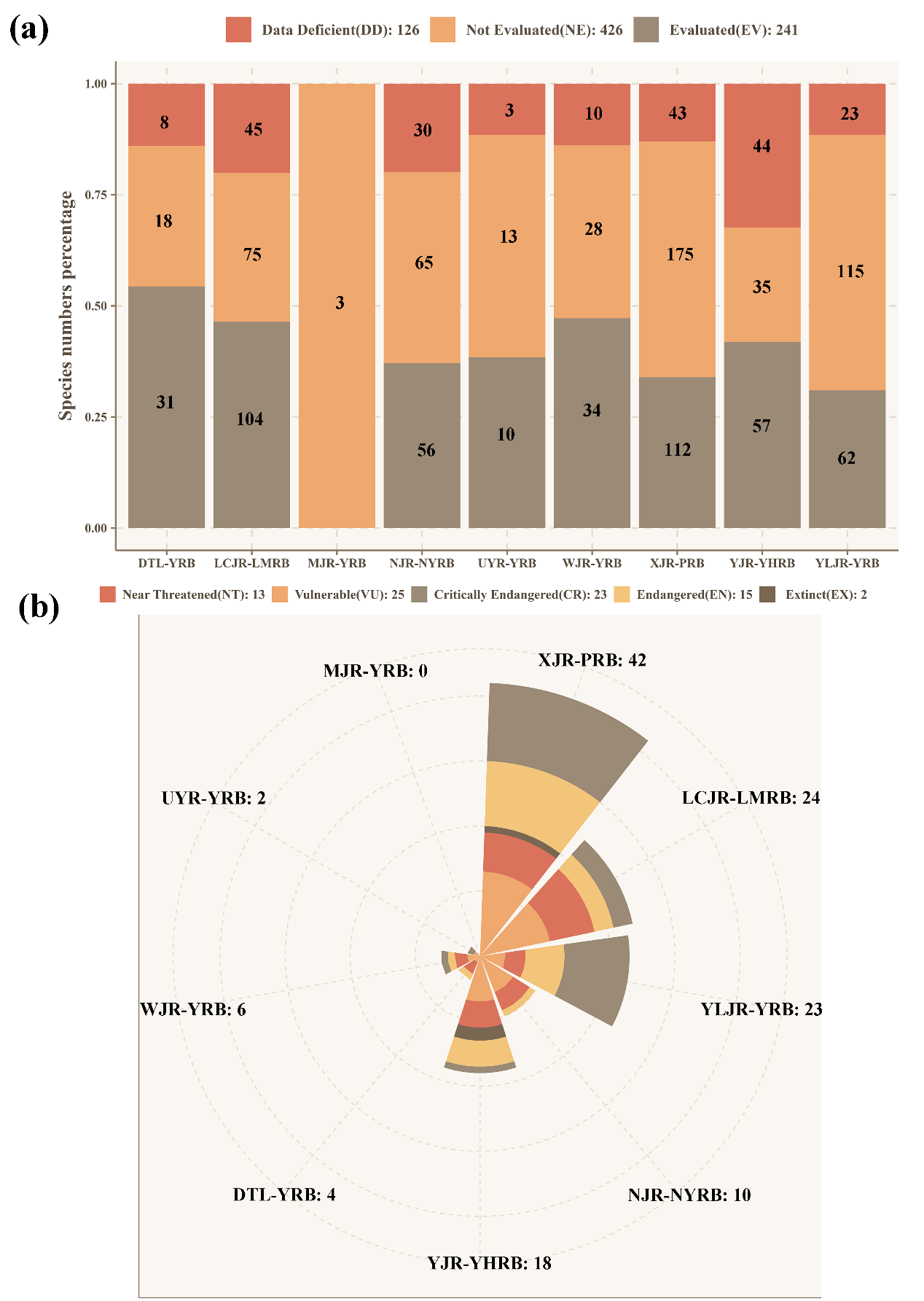 图2 云贵高原鱼类评估信息。(a)IUCN对不同子流域鱼类组成的评估信息,包括数据缺失(DD)、未评估(NE)和评估(EV);(b)9个子流域的濒危鱼类种类数(基于IUCN红色名录类别和标准,近危及以上)。