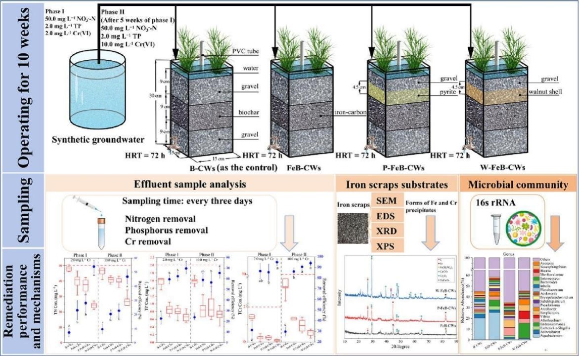 地下水常因地表污染物淋溶、下渗等作用而受到污染,NO3-、PO43-和重金属(如Cr、As)是地下水中常见的污染物,而地下水中生物可利用碳源的含量较低,微生物活性差,致使污染物难以自然消除,需采取措施予以净化后方可进行资源化利用。在国家级大学生创新创业训练项目“铁碳微电解人工湿地净化污染地下水的研究”等的支持下,项目组采用铁屑和生物炭的混合物作为人工湿地基质,并添加硫铁矿和核桃壳作为电子供体,用于处理含NO3-、PO43-和Cr(VI)的地下水。结果表明,与填充传统基质的对照人工湿地相比,铁碳基人工湿地能够对地下水中的三种污染物同步取得显著较好的处理效果,物相分析显示,Cr(VI)被有效地还原为Cr(III)并形成稳定沉淀。核桃壳作为一种农业废弃物,能够通过驱动混合营养反硝化和Cr(VI)还原作用显著增强铁碳基人工湿地净化地下水的效能。而硫铁矿的提升效能不甚理想。铁碳混合物和核桃壳的加入富集了反硝化和Cr(VI)还原菌群,铁与PO43-形成稳定沉淀,进而达到良好的地下水修复效果(图1)。该工作以Simultaneous removal of nitrate, phosphate and Cr(VI) in groundwater by iron-carbon-based constructed wetlands: Performance intensification by organic solid amendments为题发表在Journal of Water Process Engineering(中科院二区,IF:6.3)杂志上,