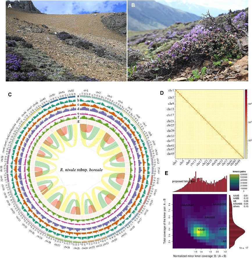 北方雪层杜鹃(Rhododendron nivale subsp. boreale)生长于寒冷、氧气稀薄的高海拔山顶地区,为理解其适应恶劣环境的分子机制,bat365中文官方网站申仕康研究团队利用Pacbio HiFi测序,结合Hi-C测序和转录组测序技术,成功组装并注释了该植物的四个亚基因组。这些亚基因组提供了完整的遗传信息库,揭示了该植物潜在山顶环境适应性遗传变异。