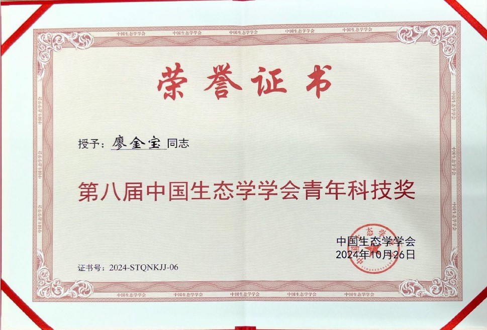 2024年10月26日,第二十三届中国生态学大会在沈阳召开。大会开幕式上颁发了“第八届中国生态学学会青年科技奖”,bat365中文官方网站/生物多样性研究院廖金宝教授获此殊荣。