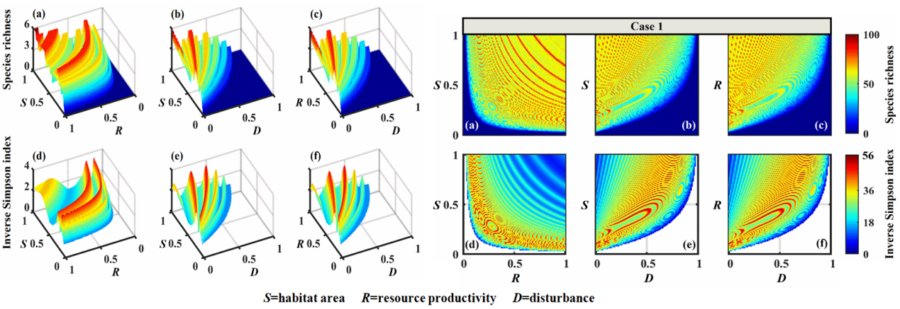 目前关于生物多样性与生境面积(即种-面积关系)、资源生产力(即生产力-多样性关系)以及干扰(即干扰-多样性关系)等重要环境因素之间的关系仍存在大量的困惑与争论。为此,廖金宝课题组构建了生境位点竞争-定殖权衡动态模型,并整合了生境面积、资源生产力以及干扰等多环境因素。通过数值模拟与分析论证,发现在竞争-定殖权衡机制下生物多样性(如物种丰富度以及逆辛普森指数等)随着环境梯度产生了多峰特性,而非传统认为的单调递增、递减或单峰关系。该多峰模态恰好可以解释自然界中所观察到的各种不同的生物多样性响应,从而调和了目前关于生物多样性与各环境因素关系的争议。此外,这些环境驱动因素之间存在强烈的交互效应,可以导致生物多样性产生复杂的非线性响应。