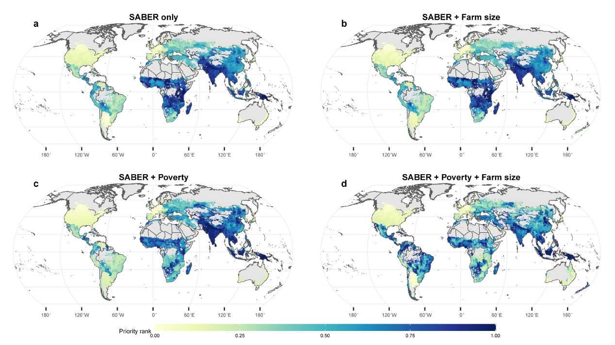 本研究通过构建人群暴露风险评估模型,定量揭示了全球范围内农民土壤抗生素暴露风险的空间格局,并分析了收入水平和农业规模化经营对土壤抗生素暴露风险的影响,发现小规模农田(<50公顷)将导致农民面临较高的暴露风险,尤其是在相对贫困地区。为有效平衡农民暴露风险、就业机会和劳动时间三者之间的关系,需要进行适度的农田规模化经营,研究发现其最适宜的规模约为1000公顷。研究进一步通过空间优化算法评估了地形和贫困约束下农田景观规模调整的空间适宜性,识别了全球优先区域,发现在前44%的优先区域(该区域暴露风险较高,以小规模农田为主,且低收入农民较少)进行农田景观规模优化可实现社会-生态效益最大化(图1)。研究结果凸显了农田景观规模调整在降低土壤污染暴露风险和推动可持续农业实践方面的重要性。尽管当今正朝着农业规模化经营模式发展,但本研究也同时强调通过规模化经营降低土壤抗生素暴露风险的同时,需权衡其带来的社会效益与风险,特别是在低收入地区,保持一定比例的小规模农田对确保农民生计至关重要。