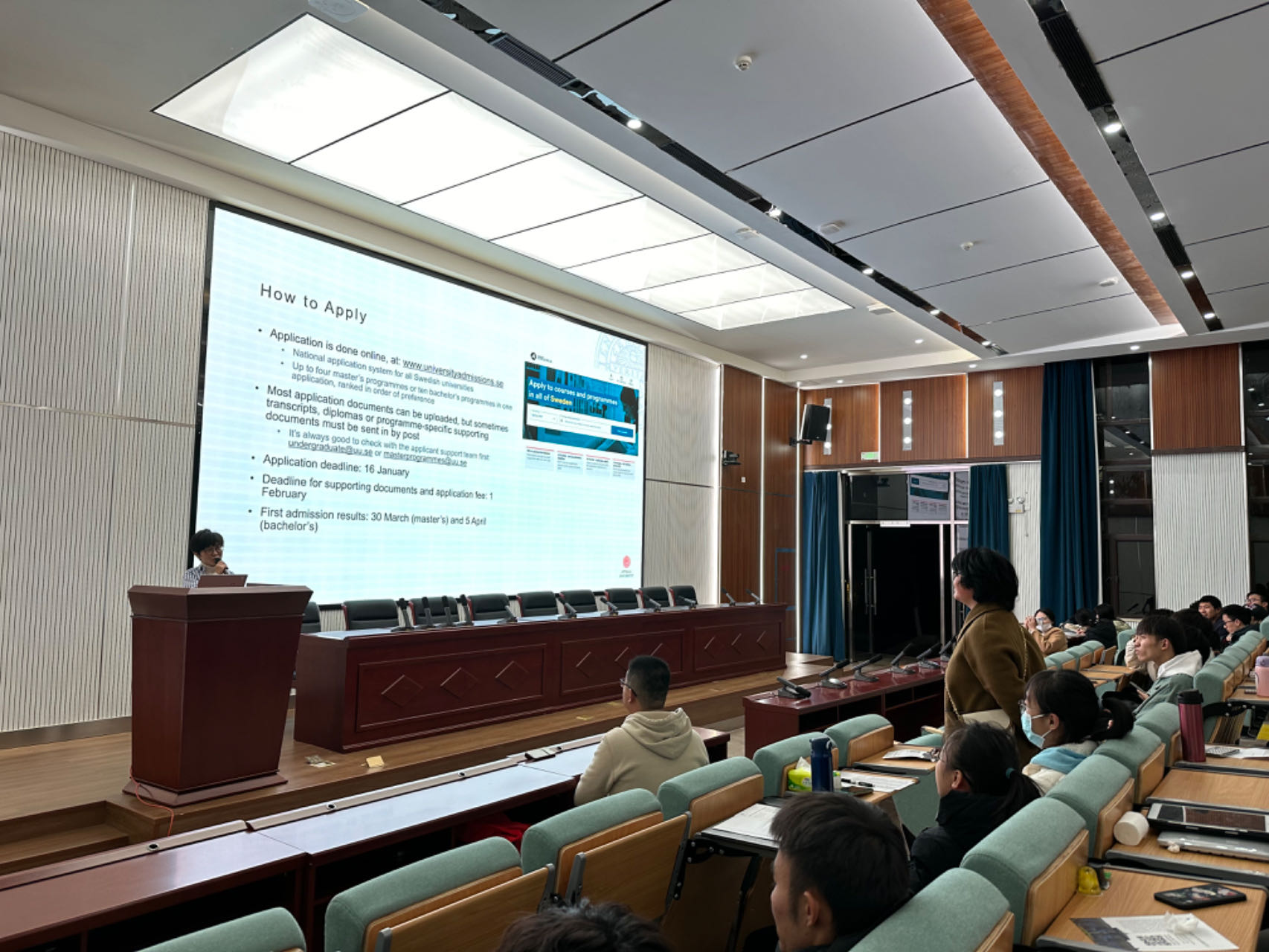 202419日下午7点整,瑞典乌普萨拉大学国际交流中心处的代欣老师应bat365中文官方网站特邀,于国重大楼一楼报告厅为我院多名本科生进行招生宣讲。本次宣讲会由我院张志明教授(副院长)主持。宣讲会伊始,同学们了解了乌普萨拉大学(Uppsala University)是坐落于瑞典古都乌普萨拉市的一所欧洲知名综合研究型大学,是拥有500余年历史的北欧地区最古老的学校。它于1477年由雅各布·乌尔夫松(Jacob Ulvsson)创立。其校友涵盖诺贝尔奖创立者阿尔弗雷德·诺贝尔、生物学家林奈、著名物理化学家阿伦尼乌斯、前联合国秘书长道格·哈马绍,及Skype创始人尼可拉斯·曾斯特罗姆等众多世界知名人物。截至目前,该校共有16位校友及教职工荣获诺贝尔奖,也是拥有诺贝尔奖得主和瑞典皇家科学院院士校友最多的瑞典大学。