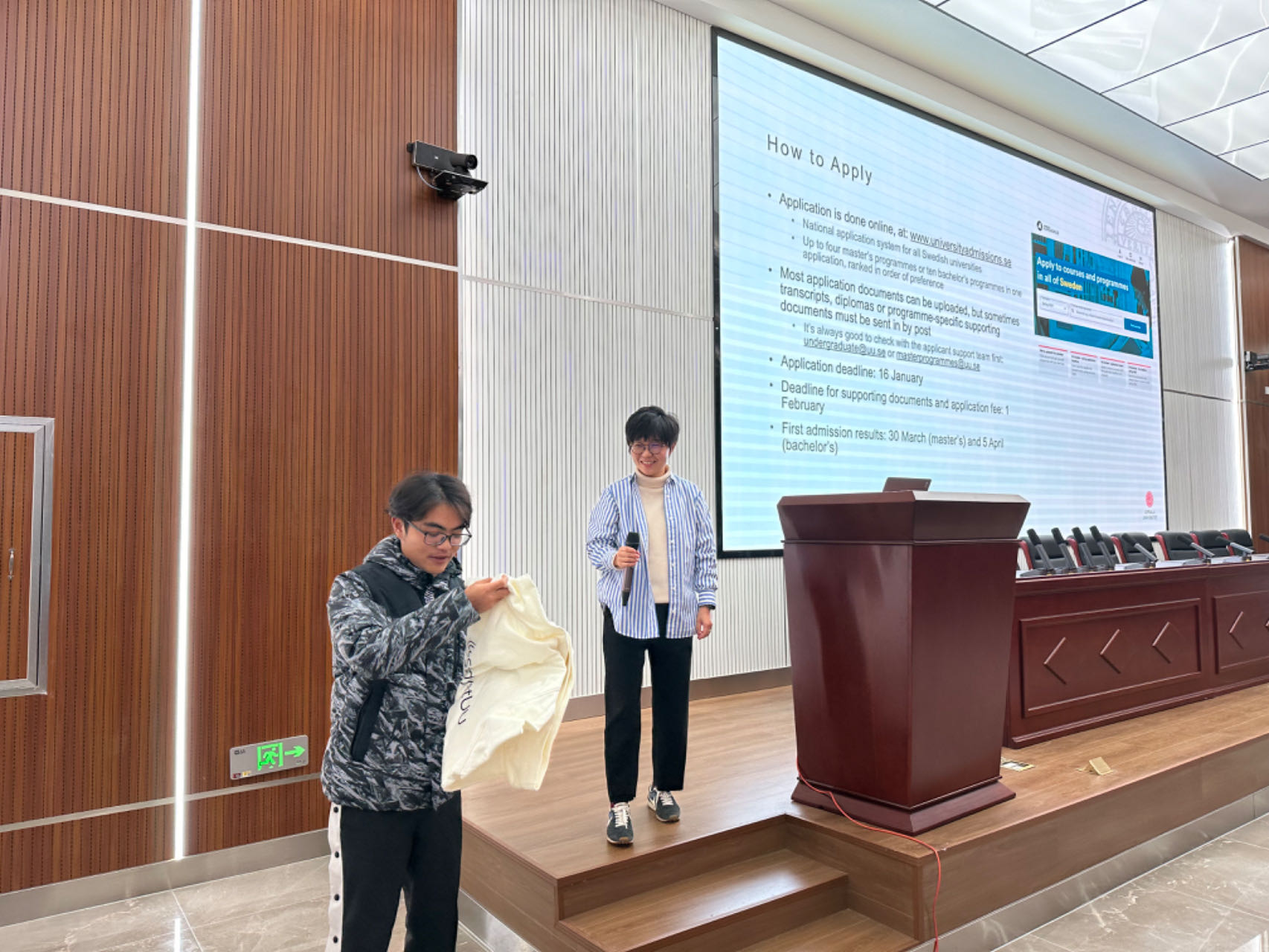 最后,代老师也针对宣讲会中提到的乌普萨拉大学与我院签订的“3+1”合作交流项目与同学们进行了交流和答疑,穿插其间的有奖问答互动环节也十分有趣。本次宣讲会得到在场学生的热烈反响,为我院学生后续申请乌普萨拉大学提供了重要指南。