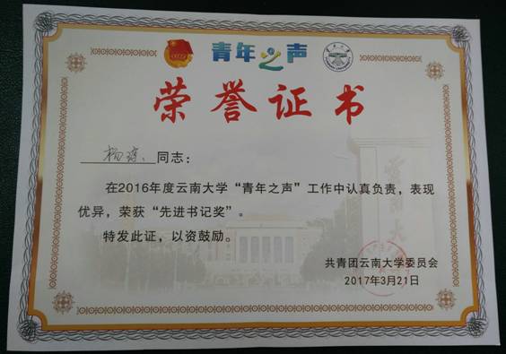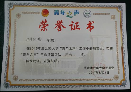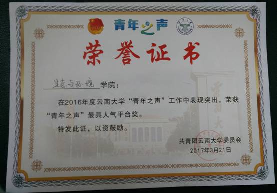 我院在2016年积极动员学院广大师生青年注册参与“青年之声”平台互动,在平台积极反映青年呼声、诉求,并定时精准回复,服务青年师生。在2016年度“青年之声”平台建设工作中表现突出,荣获“‘青年之声’平台活跃团队优秀奖”、“‘青年之声’最具人气平台奖”,学院团委负责人杨琼荣获“先进书记奖”。