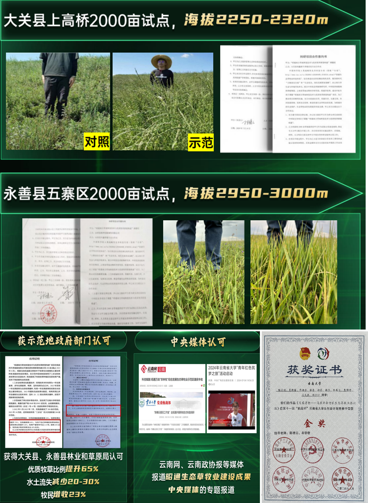 项目组开发的生长促进和低温发酵技术和产品,在大关县上高桥示范2000亩,永善县五寨区示范2000亩。示范区牧草产量提高40%,每年可达6-8吨,优质牧草比例提高70%,牧民购买饲草支出减 少40%。退化草地修复示范技术获得大关县、永善县林业和草原局认可,水土流失减少20-30%,牧民增收23%,云南网、云南政协报等媒体报道昭通生态草牧业建设成果。以牟宗敏等教师党员指导的《乌蒙草情一乌蒙革命老区生态草牧业振兴路》在第十一届挑战杯云南省大学生创业计划竞赛中荣获金奖,目前已推荐参加国赛角逐。