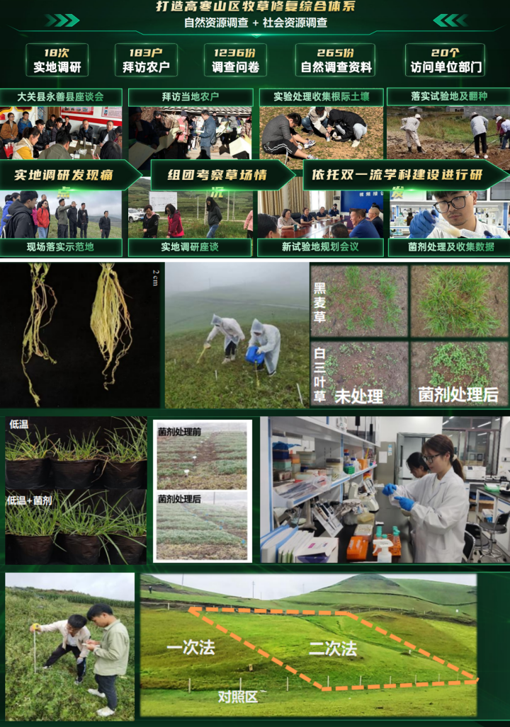 植物学与动物学党支部科研团队深入乌蒙昭通革命老区开展高寒山区退化草地修复产学研一体的研究,服务革命老区乡村振兴。从根源上解决乌蒙山区水土流失问题,守住长江流经云南的最后一站,为长江上游生态保护提供可行方案。我们致力于通过生态草牧业的发展,为乌蒙山革命老区带来经济繁荣、生态和谐与社会进步的全面效益。本案例的实施,增强了支部师生党员的科研和业务能力,提升了师生的知识转化运用能力和社会服务能力。我支部将继续统筹推进科研-教学-社会服务一体化的人才培养模式,继续提升师生的业务能力、问题解决能力和社会服务能力,以更好地服务于国家的现代化建设和社会的发展需求。持续产出机理清晰,适用性强、可转化落地的科研成果,为云南省生态农业发展贡献团队智慧。